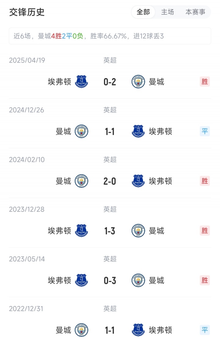 截至赛前,曼城4胜1平2负积13分,排名英超积分榜第5;埃弗顿3胜2平2负积11分,排名英超积分榜第8。
