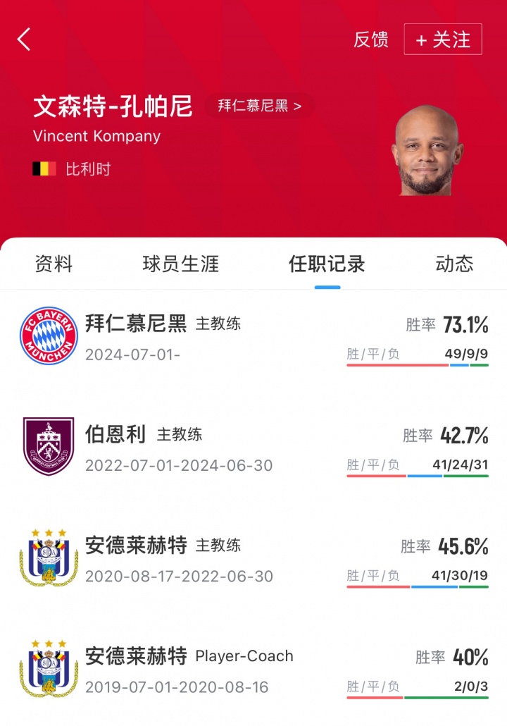 孔帕尼现年39岁,比利时籍教练,他于2024年7月成为拜仁主帅,带队67场49胜9平9负,他与拜仁的原有合同要持续到2027年,此次续约使得他在拜仁的执教生涯延长了两年。本赛季,拜仁开局取得11连胜,目前领跑德甲、欧冠积分榜。